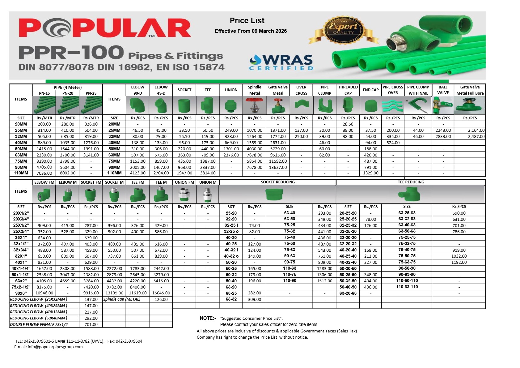 PPR-100 Pipes and Fittings Updated Price List